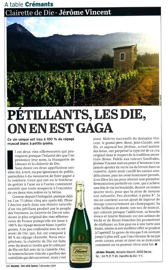 Un très bel article de Périco Légasse sur la Clairette de Die dans le Hors Série Marianne de Décembre !!